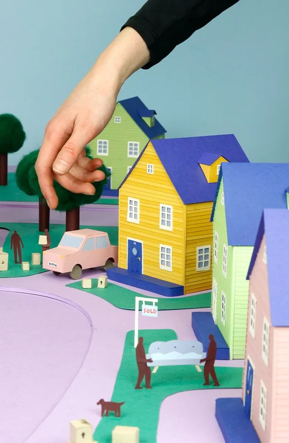 I was commissioned by the company Hire A Helper, to create a series of illustrations and stop motion animations for their annual migration report. I created an American neighbourhood out of paper, felt and card. See the stop motion video I created below.